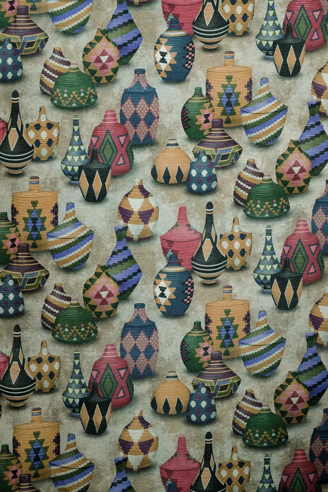 Grupos de cestas de estilo marroquí, estampadas en nuestro suave paño de lino viscosa. Ofrece dos versiones de colores, una vibrante y fiel a los colores tradicionales de los mercados marroquíes y otra más suave en tonos pastel.