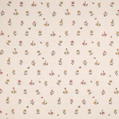 Delicate smaller blooms, inspired by the original Antique Flower, are gently scattered across an open ground, with bumblebees and ladybirds adding a whimsical touch. Part of the Antique Flower collection and also available as a linen print.